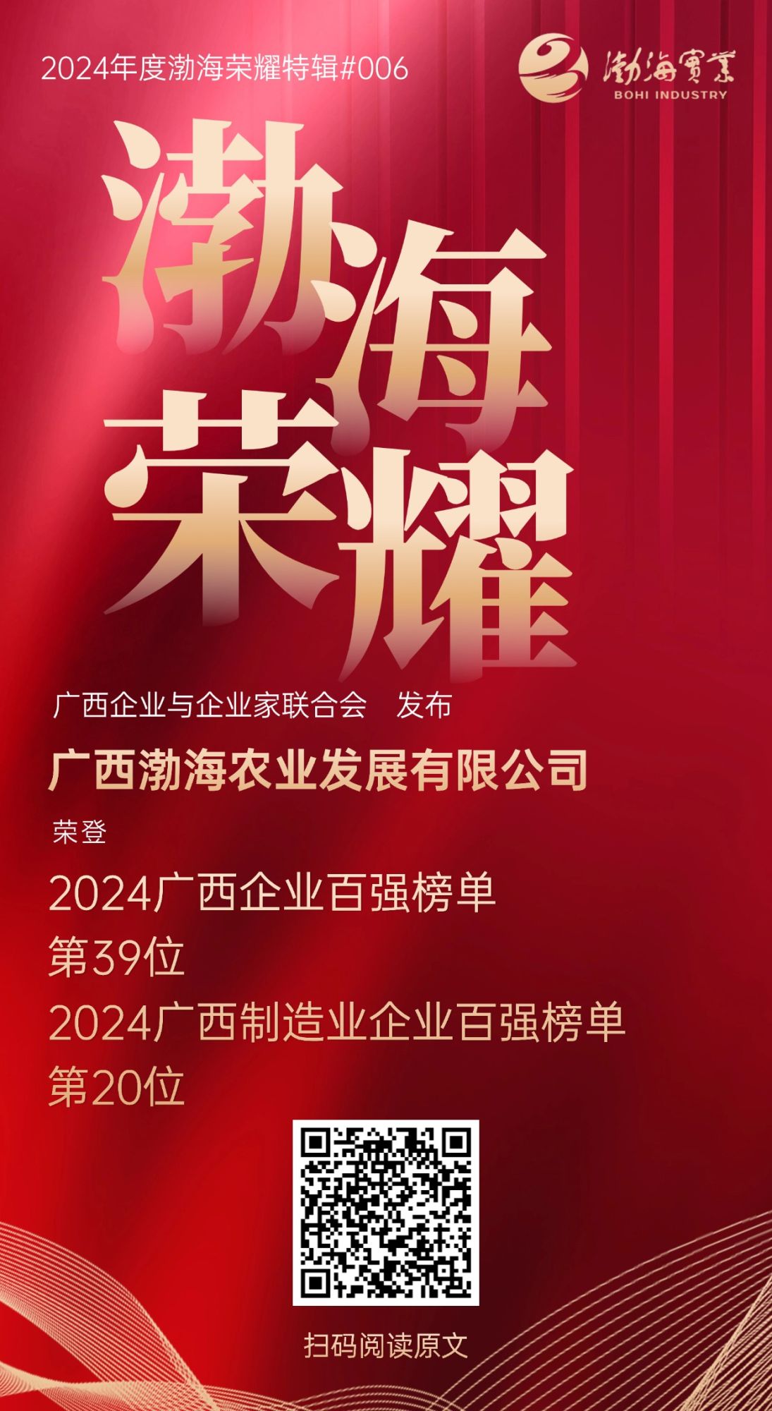 廣西渤海農(nóng)業(yè)發(fā)展有限公司分別位列2024廣西企業(yè)百強榜單第39位和2024廣西制造業(yè)企業(yè)百強榜單第20位。