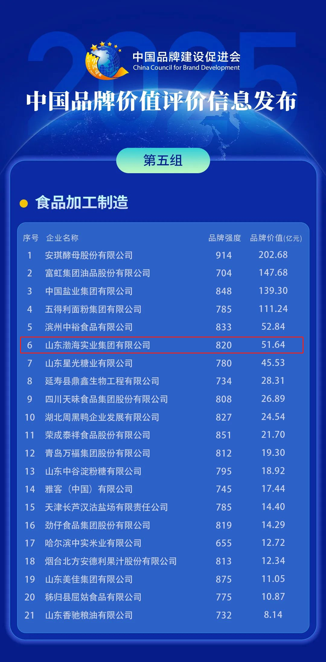 渤海實(shí)業(yè)上榜“中國(guó)品牌價(jià)值評(píng)價(jià)信息發(fā)布”,位列食品加工制造行業(yè)第6位