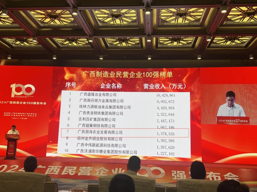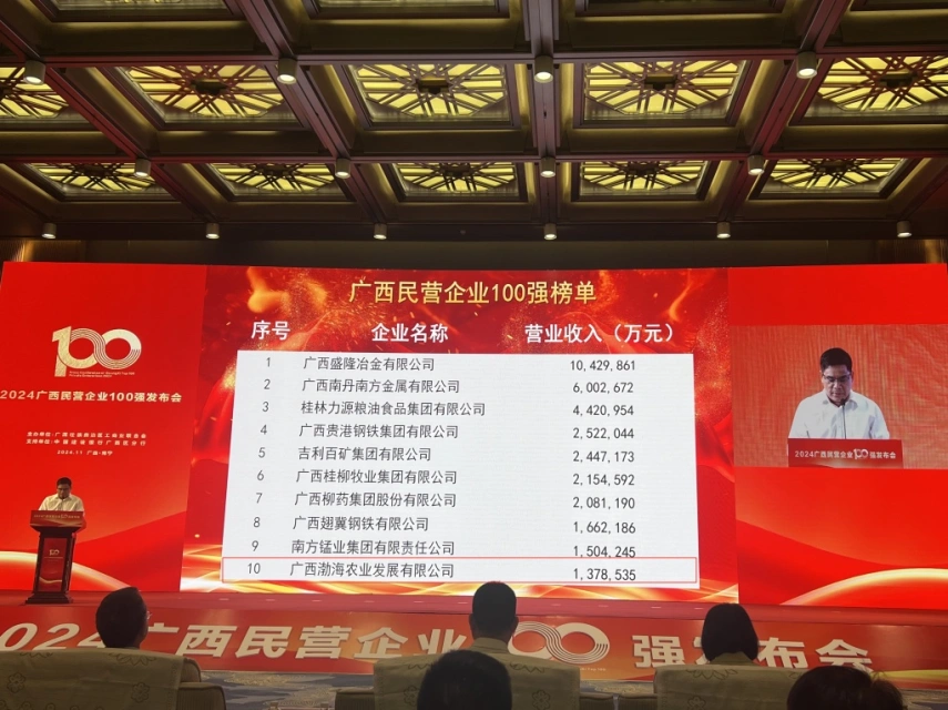 廣西渤海農(nóng)業(yè)發(fā)展有限公司分別位列2024廣西民營(yíng)企業(yè)100強(qiáng)榜單第10位和2024廣西制造業(yè)民營(yíng)企業(yè)100強(qiáng)榜單第7位。